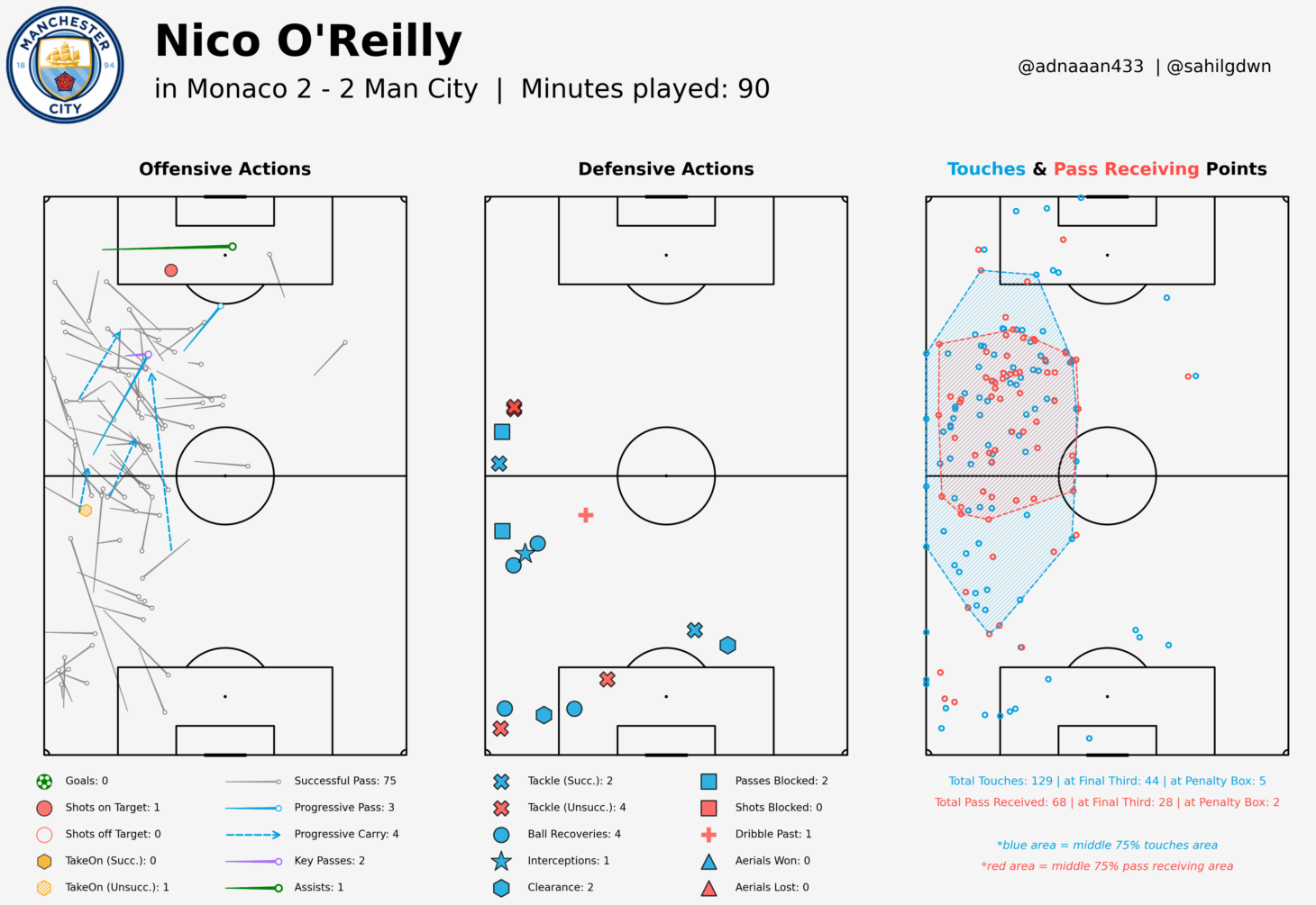 Another 90' for Nico O'Reilly against Monaco, who I thought was fantastic this evening. Provided an assist for Erling Haaland. Made the most tackles in the game (6). 7/11 ground duels won. Driving the ball forward on the left side. Frequently making runs into the box. He looks much more settled within the first team, playing at left-back, and I'm sure an England call-up will come if he continues at this level.