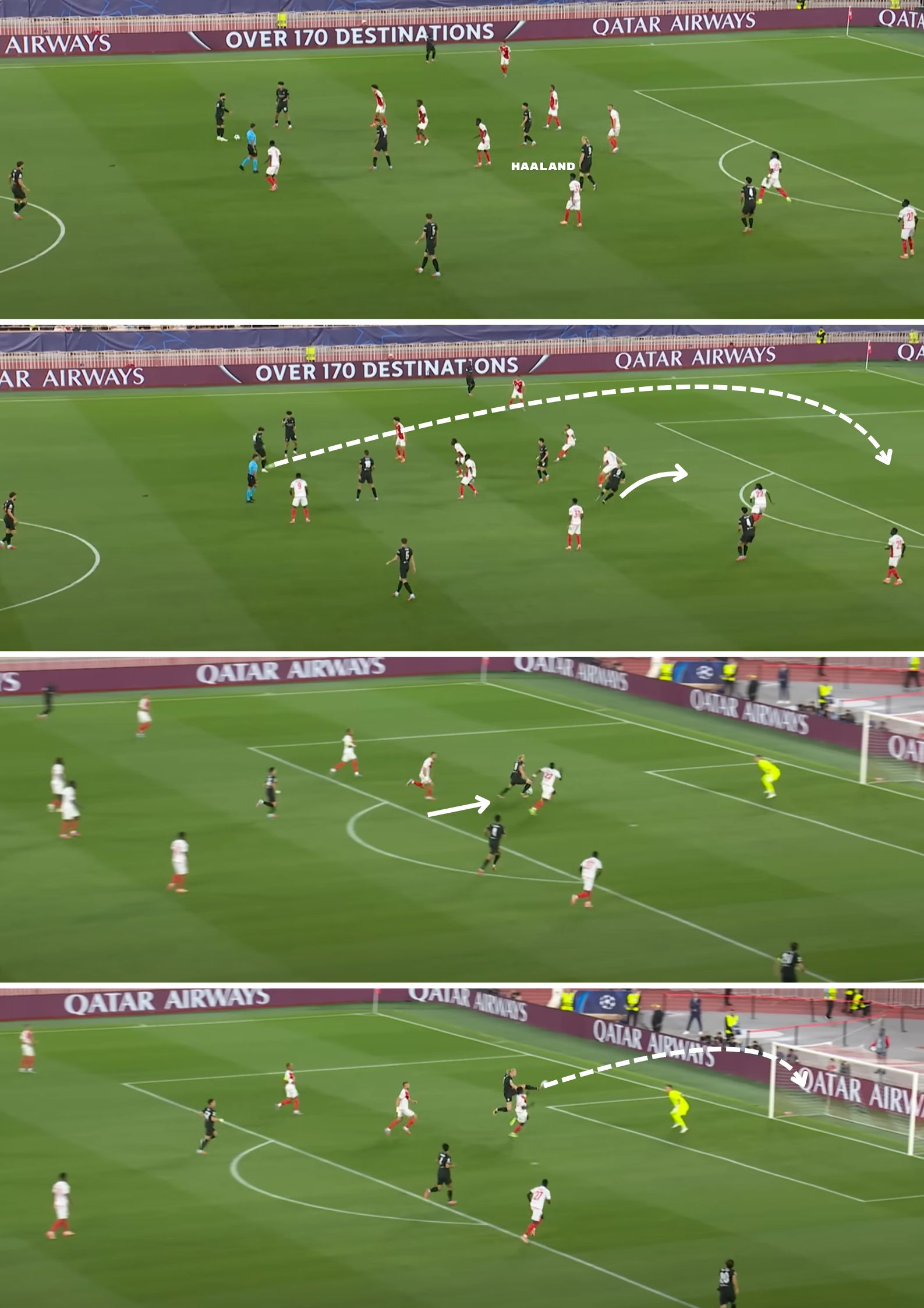 For both goals, the movement by Haaland is excellent, and something he's done well this season is finding the right space around the central defenders. In their blind spots, drifting between them and the midfielders, so none of the opposition players are certain who is marking him. Gvardiol spots Haaland making the run and picks him out with the ball over the top. Let the ball bounce before lifting over the keeper. Similar to the goal against Napoli, which was with his head, only a gentle touch was needed to score.