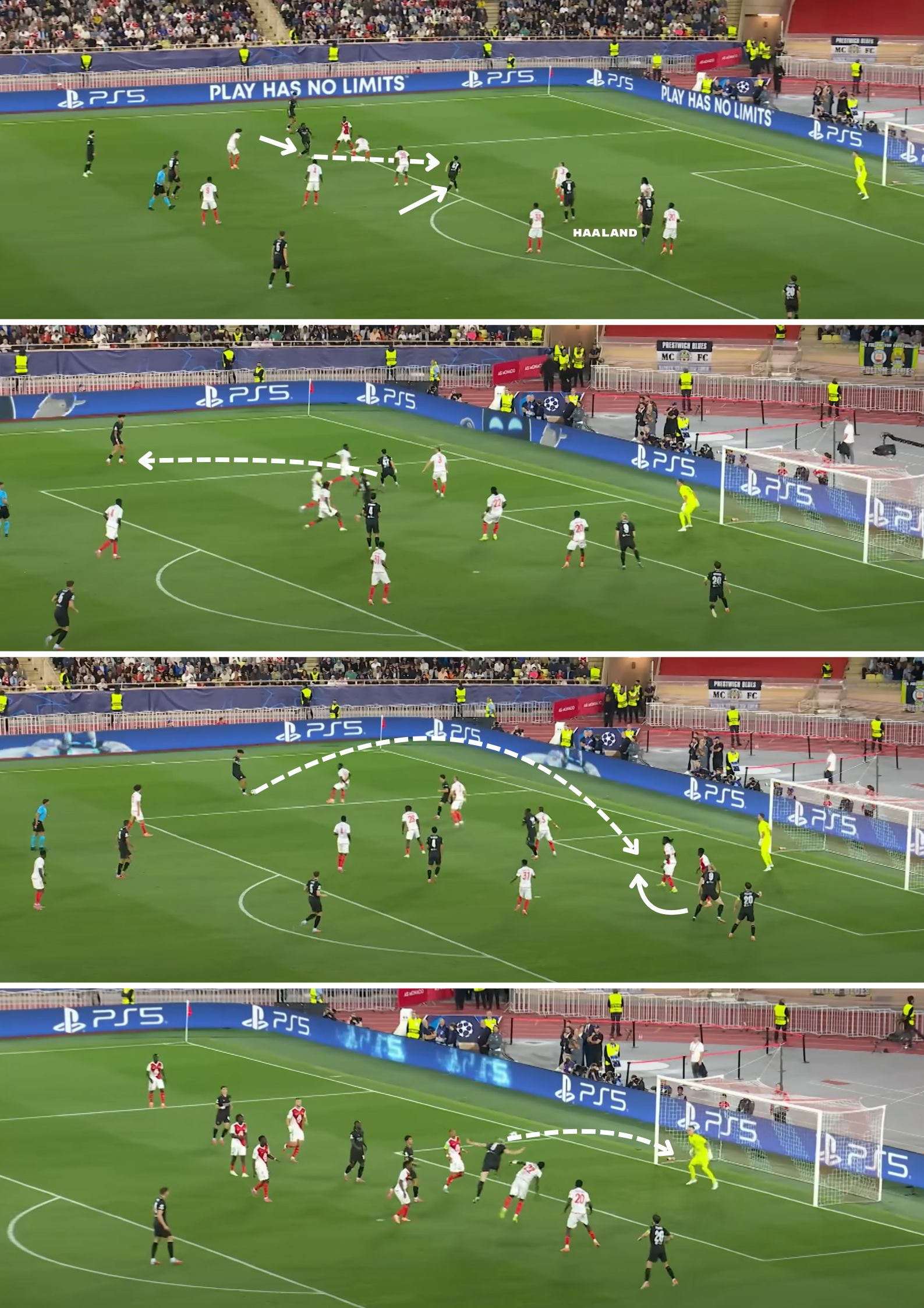 Strong team selection from Guardiola, which is mostly to be expected, and using a back three in possession. Something we’ve seen a lot in recent years is how to best manage the threat of the opposition in transition. Nico O’Reilly, in his usual role coming inside from left-back, Monaco wanted to maintain a 2v1 against Jeremy Doku as Akliouche supported Vanderson. That meant the spaces to attack were inside, with Bernardo on the opposite side in a functional role, holding the width as the team attempted to find Foden between the lines.