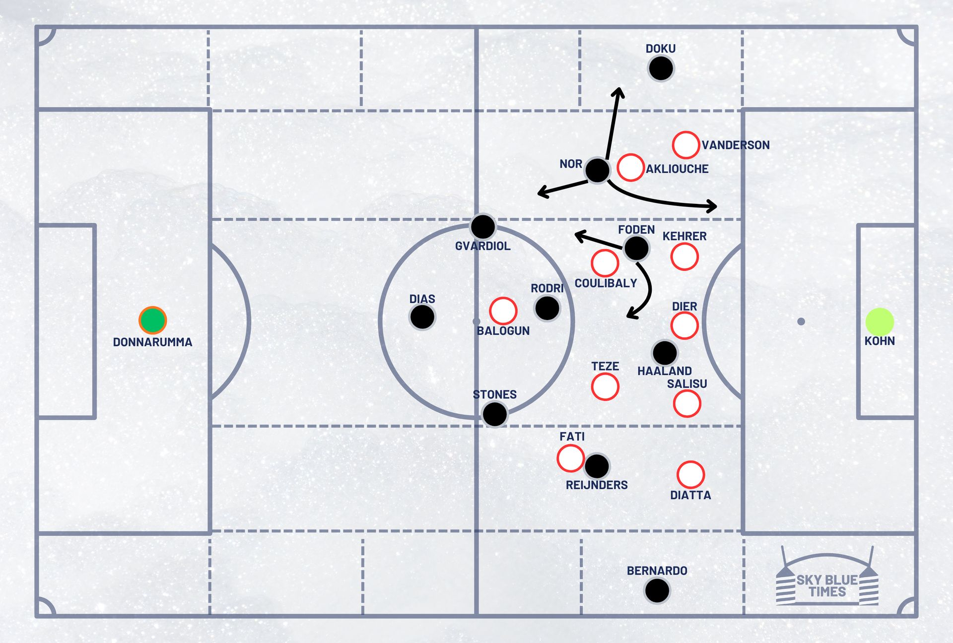 O'Reilly holding the width as Doku drives inside, picking out the run of Foden into the box, who turns, delays, and plays it back to O'Reilly for the cross. Lovely cross from NOR. Haaland is initially at the back-post, then moves around to the middle of the box to head the ball into the bottom left corner.